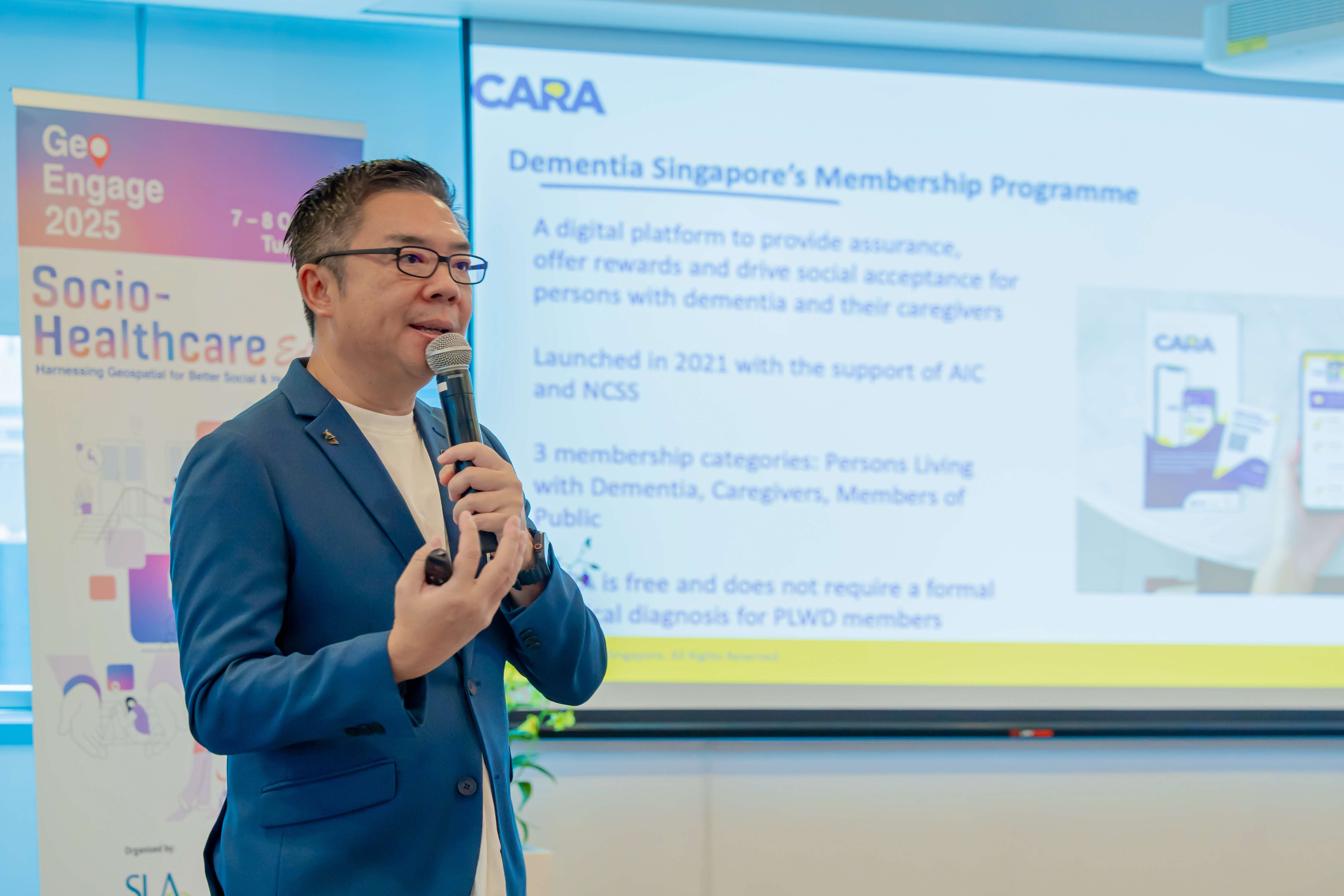 Mr Bernard Lim, Director of Advocacy & Communications at the Dementia Singapore, introduced CARA - the organisation’s lifestyle and digital community platform, that's transforming dementia care through innovative location technology. This solution harnesses location intelligence to safely trace missing dementia patients while maintaining a detailed map of over 800 dementia Go-To-Points (GTP) across Singapore. The platform's GTP locator feature empowers users to quickly identify the nearest support touchpoints, where specially trained staff stand ready to assist persons with dementia, creating a city-wide safety network that provides peace of mind for families and caregivers.