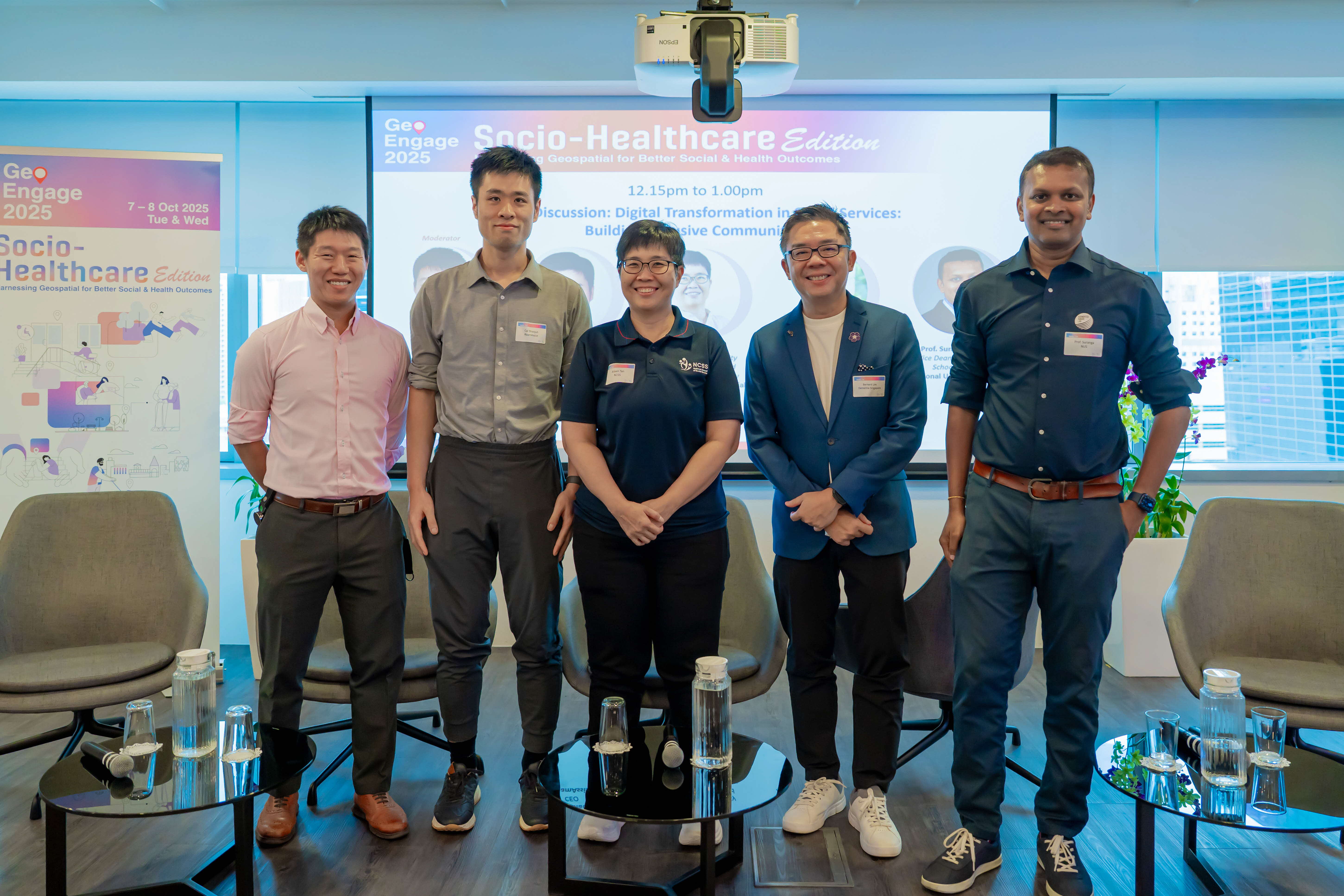 Moderated by Mr Tan Guo Jun, Deputy Director (Geospatial & Data) at SLA, the panel brought together voices from across sectors – Mr Bernard Lim (Dementia Singapore), Prof. Suranga Nanayakkara (NUS), Ms Aileen Tan (NCSS), and Mr Cai Shaojun (RoamAssist) – for an afternoon of lively and thought-provoking discussion.